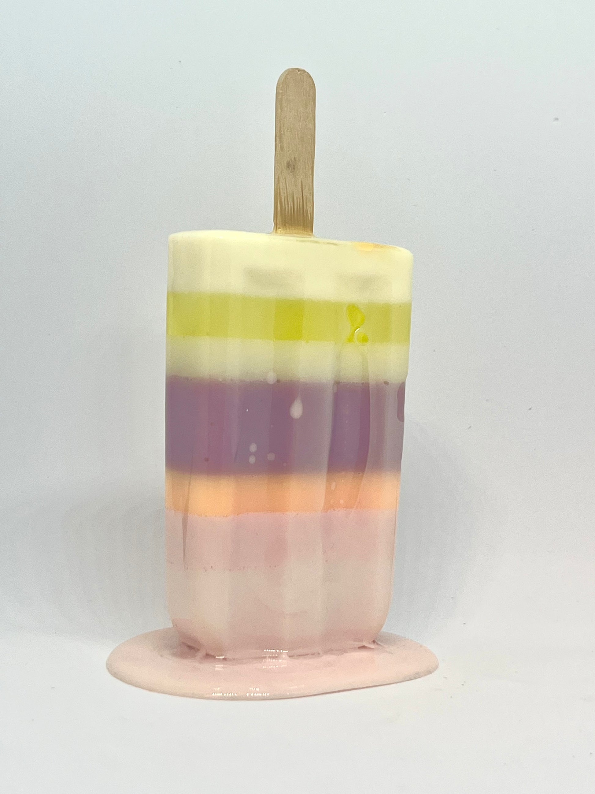Dekorativ skulptur i resin i form av en smältande glass. Ett lekfullt men stilrent objekt som fungerar lika bra som inredningsdetalj som konstföremål. De rinnande formerna och mjuka färgövergångerna ger skulpturen ett levande uttyck och gör varje exemplar unikt.