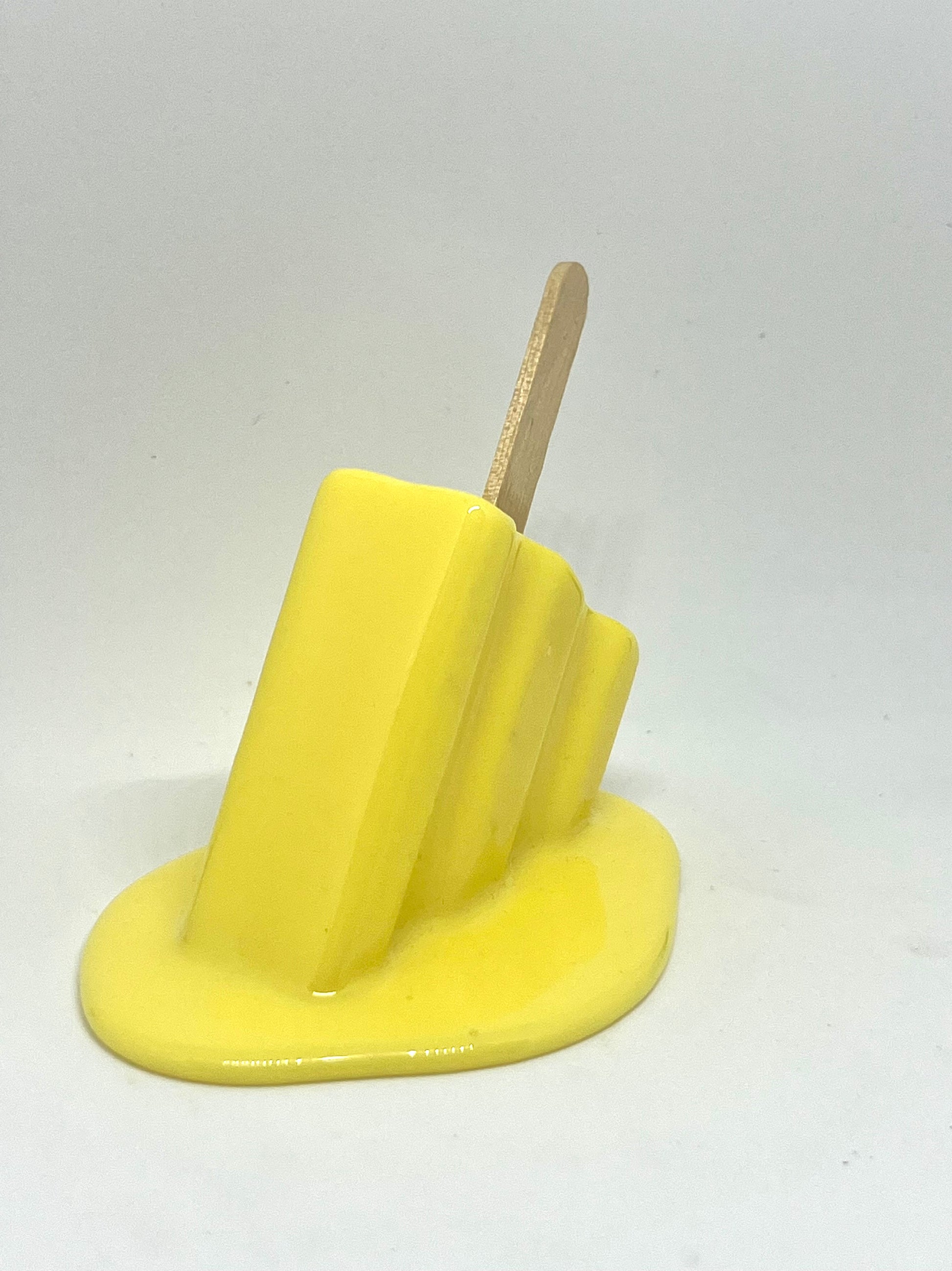 Dekorativ skulptur i resin i form av en smältande glass. Ett lekfullt men stilrent objekt som fungerar lika bra som inredningsdetalj som konstföremål. De rinnande formerna och mjuka färgövergångerna ger skulpturen ett levande uttyck och gör varje exemplar unikt.